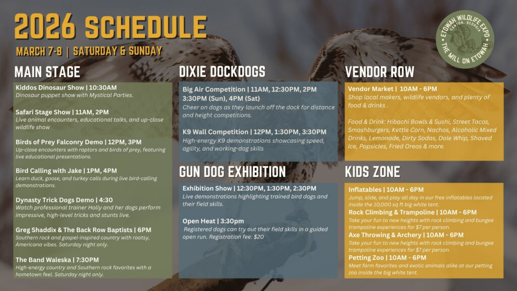 The Etowah Wildlife Expo is a full day festival on March 7th & 8th, 2026 held at the historic Mill on Etowah in Canton, Georgia.